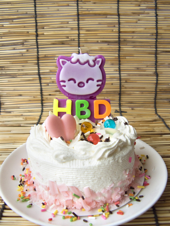 おいしいミニ幸せな誕生日甘いケーキ ピンクとホワイト チョコレートとバニラのケーキ装飾砂糖ゼリー ゼリー ボールと誕生日キャンドル籐ヤシのマットの背景に白いプレート の写真素材 画像素材 Image 2818